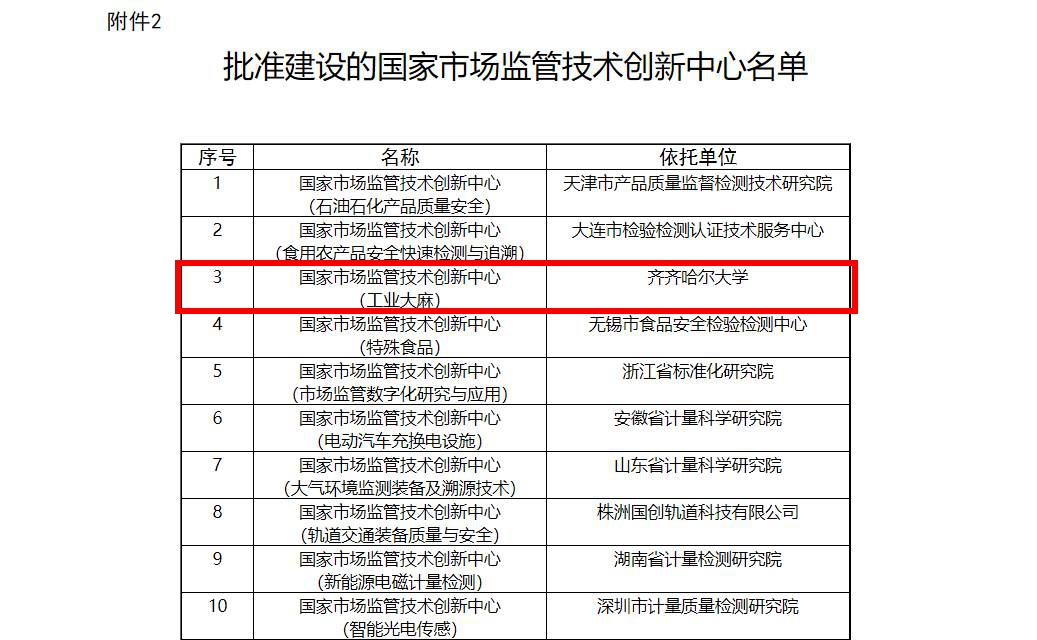 近日,国家市场监督管理总局下发了《市场监管总局关于批准建设“食品安全重大综合保障关键技术”等38个国家市场监管重点实验室和“石油石化产品质量安全”等19个国家市场监管技术创新中心的通知》(国市监科财函〔2021〕208号)。万象城与齐齐哈尔市市场监督管理局联合组建,化学与化学工程学院赵明教授担任创新中心主任的国家市场监管技术创新中心(工业大麻)成功获批,成为国家市场监管总局首批批准建设的19个国家市场监管技术创新中心之一。该创新中心对于完善工业大麻及其制品检验检测标准,构建工业大麻种植加工质量控制体系,解决工业大麻加工技术关键科学问题,促进工业大麻产业链下游产品的开发,推动我国工业大麻产业高质量健康发展具有重要的意义。