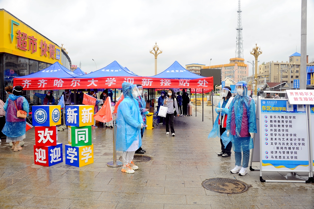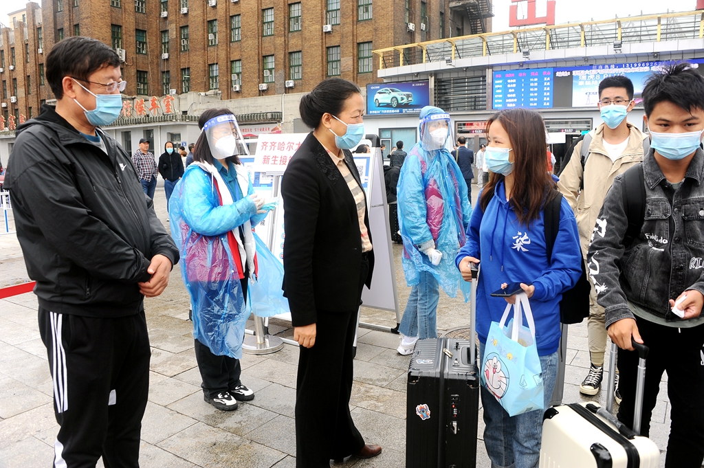 学校在齐齐哈尔火车站、齐齐哈尔南站、站前长途客运站、三百客运枢纽站和齐齐哈尔机场组织了集中接站,现场工作的有关领导、老师、学生志愿者们打着引导牌、挥舞着旗帜,积极有序地迎接刚刚走下火车的新生同学及家长,组织大家及时坐上接站班车,顺利抵达学校。学生和家长出站后严格执行“戴口罩、测温、扫码”措施,查验龙江健康码、“完美校园”返校码,无异常情况的同学集体乘车到校直接进入校园;家长由学校专门安排的专车接送到校,为保障校园防疫安全,弥补新生家长不能进入校园的遗憾,今年学校继续为新生家长准备了专门的校园观光车,让家长在车内浏览校园。
