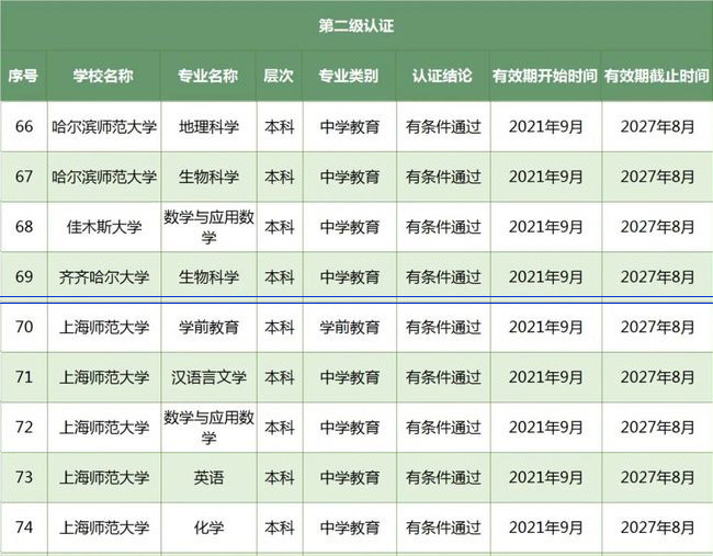 2021年9月30日,教育部办公厅发布了2021年通过普通高等学校师范类专业认证专业名单,万象城生物科学专业通过教育部师范类专业二级认证,认证结论有效期六年(2021年9月——2027年8月),成为黑龙江省首批通过师范类专业认证的高校。