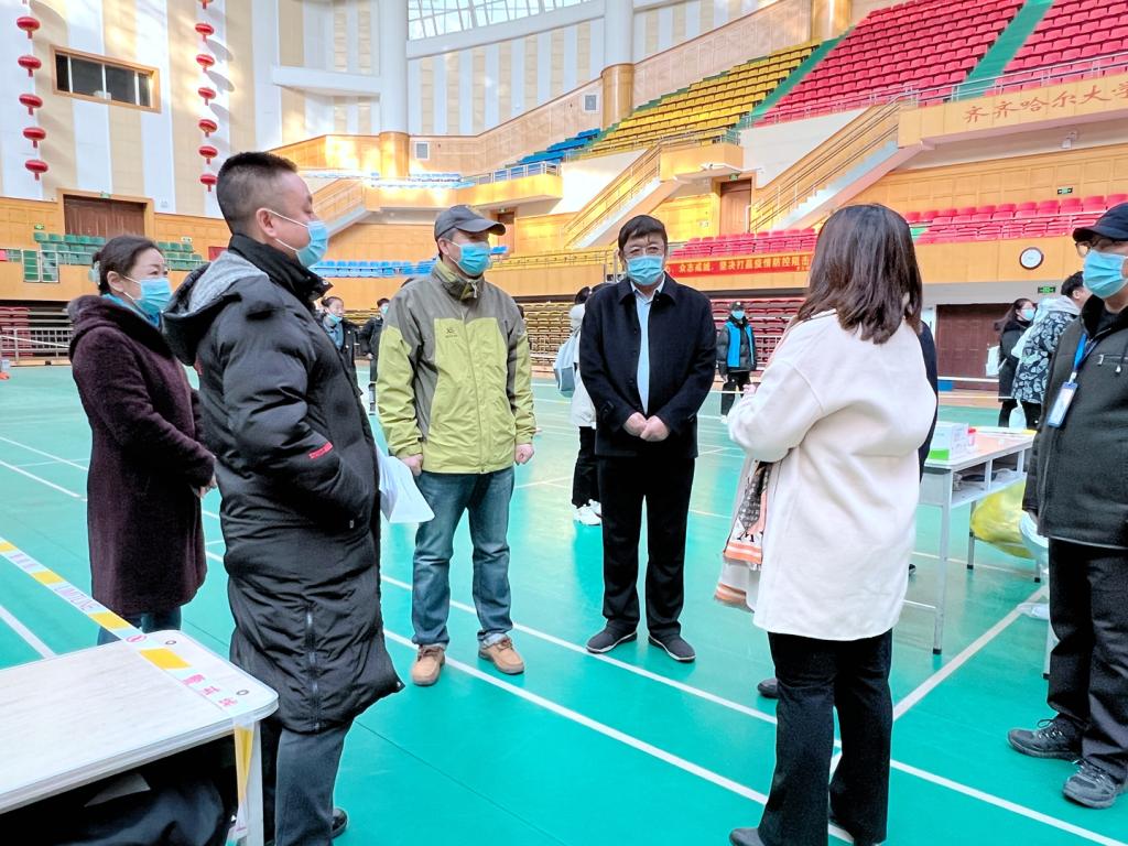 11月7日上午,校党委副书记张文治、副校长丛喜权在相关部门负责人陪同下,深入体育馆等地,仔细询问核酸检测的流程安排、人员安排、应急措施等情况,亲切慰问现场志愿者和工作人员,对各有关单位的积极配合、辛苦付出表示感谢,并强调学生全员核酸检测是学校筑牢安全防线的必要措施,相关部门和学院要充分认识到这项工作的重要性,在思想上时刻绷紧疫情防控这根弦,认真把控每个环节,确保高质量完成核酸检测采样工作。