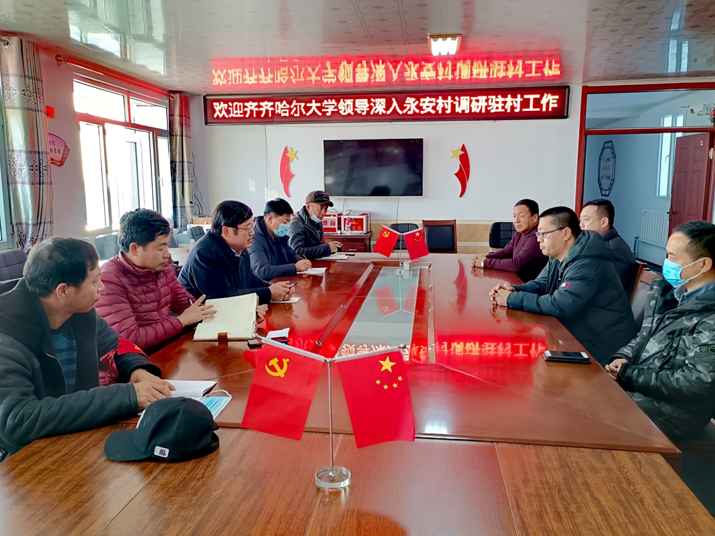 上午,在六合镇前程村会议室召开座谈会,讷河市组织部常务副部长刘建梅、六合镇党委书记刘欣悦、镇长李金波、驻村第一书记范晓峰及村“两委”班子成员参加了座谈会,会议由张文治主持。会上,张文治首先转达了学校党委对驻村第一书记的问候以及对驻村帮扶工作的关心,并与乡村两级领导进行了座谈交流。刘欣悦、范晓峰详细介绍了自去年9月以来驻村工作开展情况,就下一步工作提出计划和措施。刘欣悦谈到,一年多来,范晓峰深入农户,担当有为,在基层党建、乡风文明、疫情防控、环境整治、民主管理、“志智”双扶等方面做了扎实有效工作,特别是为村民修建了文化广场、活动室和图书室,并自费为村中小学生购买了七千余元的工具书。刘建梅就村群众性活动、产业振兴、人才培养、党建工作提出了意见建议。张文治讲到,一年多来,范晓峰能够迅速转变工作角色, 充分发挥专业优势和能力特长,与村“两委”班子成员一道,拓宽乡村振兴的新路子,为帮扶村做了实实在在的工作,得到了村民认可,希望继续保持良好的工作作风,用心用情服务村民,扎实推动驻村工作任务全面落实。张文治表示,学校党委将在前期工作基础上,充分发挥学校学科、专业和人才优势,助力乡村基层党建工作、产业发展以及乡村振兴。