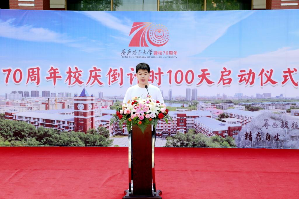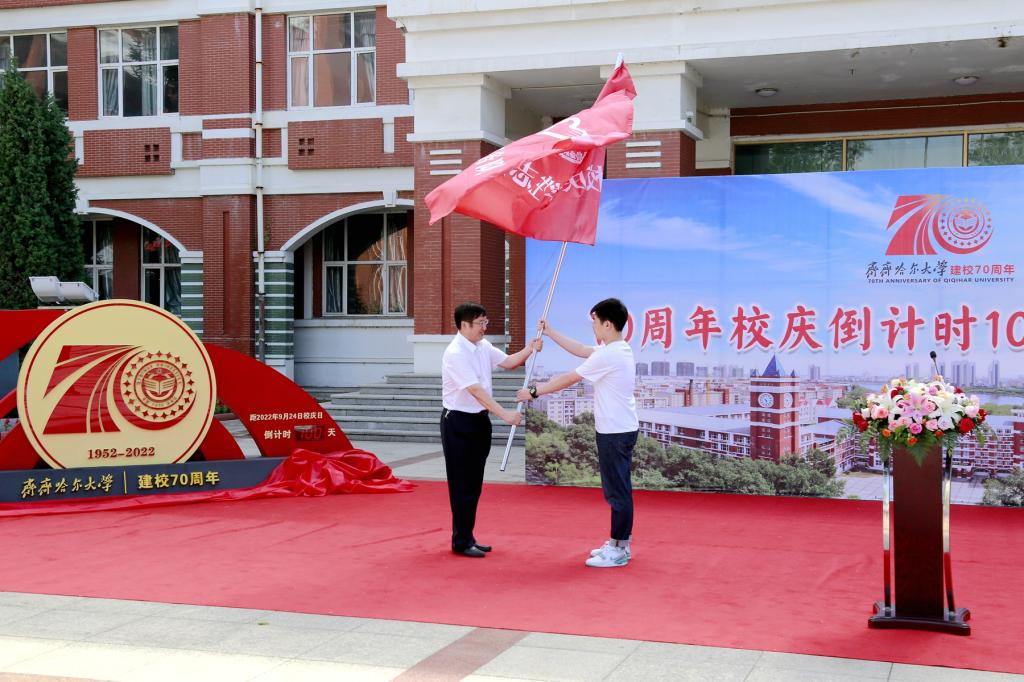 校党委副书记张文治在启动仪式上为建校70周年校庆志愿者代表授旗。轻工与纺织学院轻化191班孙玉栋同学代表校庆志愿者接旗并发言。他说,作为校庆志愿者,我们将秉持“养正毓德、精存自生”的校训精神,参与校庆、奉献校庆、服务校庆,以爱校荣校的情怀,向海内外校友和社会各界展示母校的崭新面貌,向全社会传递齐大正能量、唱响齐大好声音。