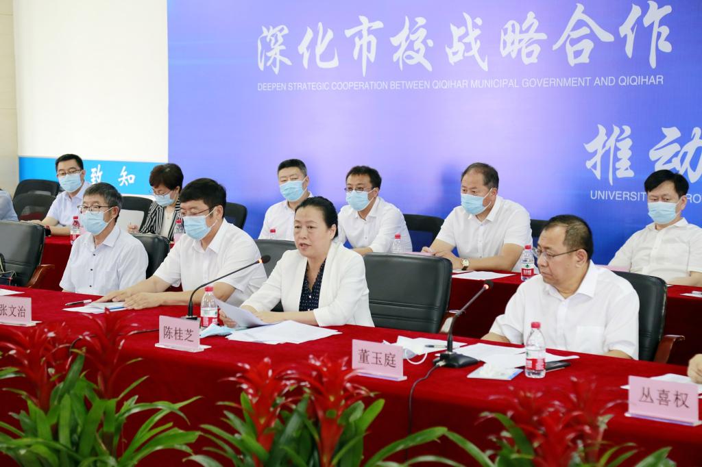 陈桂芝指出,今年是党的二十大和省十三次党代会胜利召开之年,我们的市校战略合作有政策东风、有扎实基础、有区域优势、有应用场景,必定大有可为、未来可期。她强调,站在新的历史发展和战略合作起点上,齐大将深入贯彻落实习近平总书记重要指示批示精神和许勤书记、胡昌升省长到我市调研指示精神,坚持“资源共享、优势互补、协调创新、发展共赢”的原则,聚焦齐齐哈尔市产业链供应链三年行动计划,主动融入装备制造、食品加工、生物和新能源4个“千字号”产业集群建设,推动数字经济、生物经济、冰雪经济、创意设计“四新”经济,赋能传统优势产业和战略性新兴产业,把握科技进步大方向、产业变革大趋势、集聚人才大举措,在更高维度、更大领域、更深层次推动市校合作,为新龙江、新鹤城振兴发展贡献更多的齐大智慧和力量。