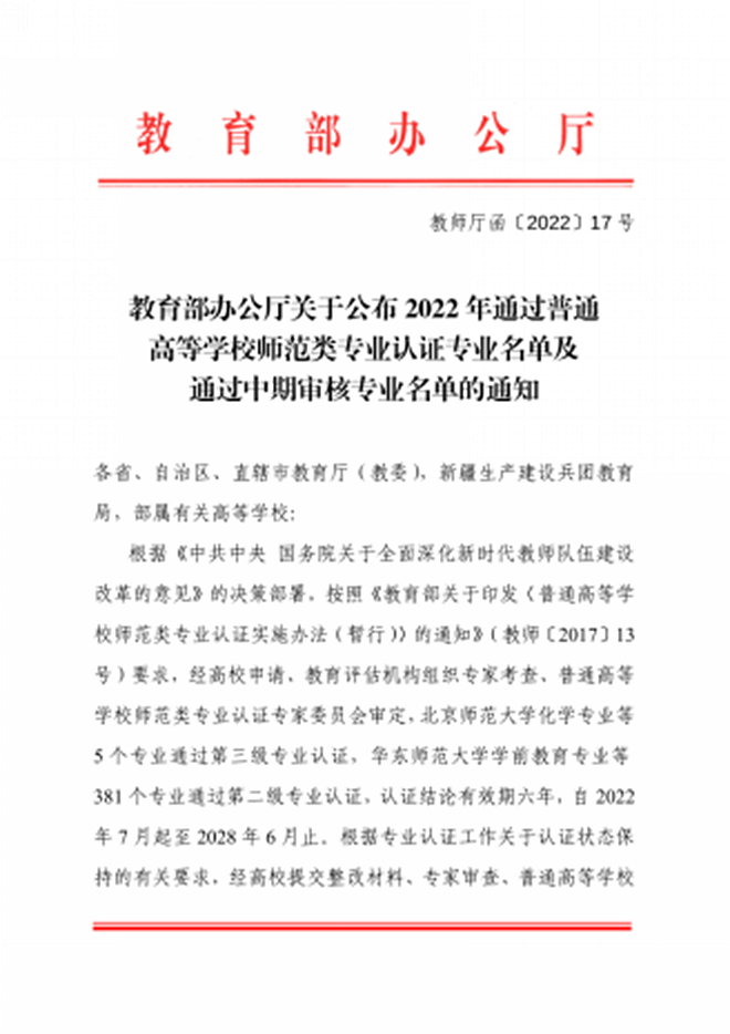 近日,教育部发布《教育部办公厅关于公布2022年通过普通高等学校师范类专业认证专业名单及通过中期审核专业名单的通知》(教师厅函〔2022〕17号),公布了2022年通过普通高等学校师范类专业认证的专业名单。万象城汉语言文学、英语、数学与应用数学3个专业通过了教育部师范类专业第二级认证,认证结论有效期为六年(2022年7月至2028年6月)。