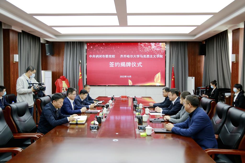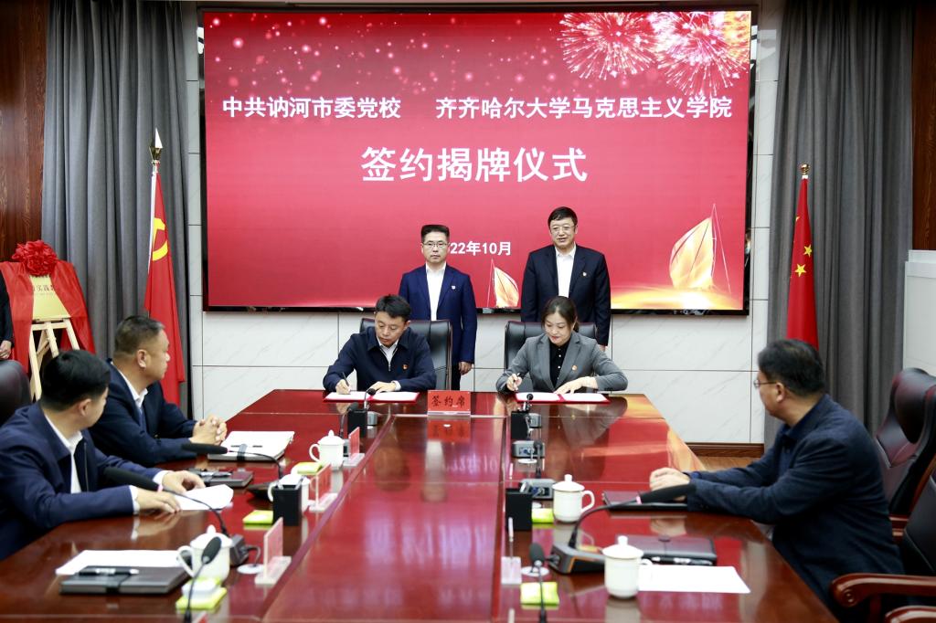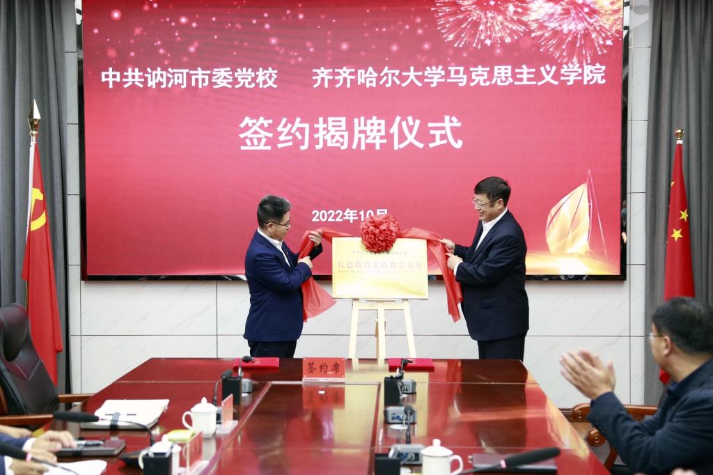 10月19日上午,万象城AWC官方网站马克思主义学院与讷河市委党校共建思想政治理论课红色教育实践教学基地签约揭牌仪式在讷河市委五楼会议室举行。校党委副书记张文治、马克思主义学院党委书记苏醒、马克思主义学院院长王圣祯、副院长张春波;讷河市委书记、党校校长王永平,讷河市委副书记李青春,市委常委、组织部长、党校第一副校长刘涛等出席活动。仪式由李青春主持。