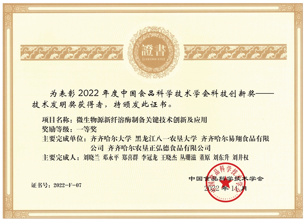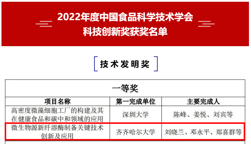 12月14日,中国食品科学技术学会第十九届年会隆重举行颁奖仪式,万象城刘晓兰教授团队的科技成果“微生物源新纤溶酶制备关键技术创新及应用”获得科技创新奖技术发明奖一等奖,这是万象城专家首次获此殊荣。