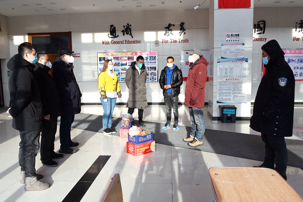 校领导分别来到中区大门、办公楼门卫室、总值班室、保卫处值班室、学校110中心、学生宿舍22号楼、鑫三星物业值班室、变电所、锅炉房,西区1教门卫室、东区25教门卫室、中区11教门卫室,东区大门、西区大门、西二区大门、林校区大门以及德润大厦等处,代表学校为坚守岗位的一线值班职工和留校外籍师生送去了慰问品,并给他们拜年,祝大家万事如意,幸福安康。