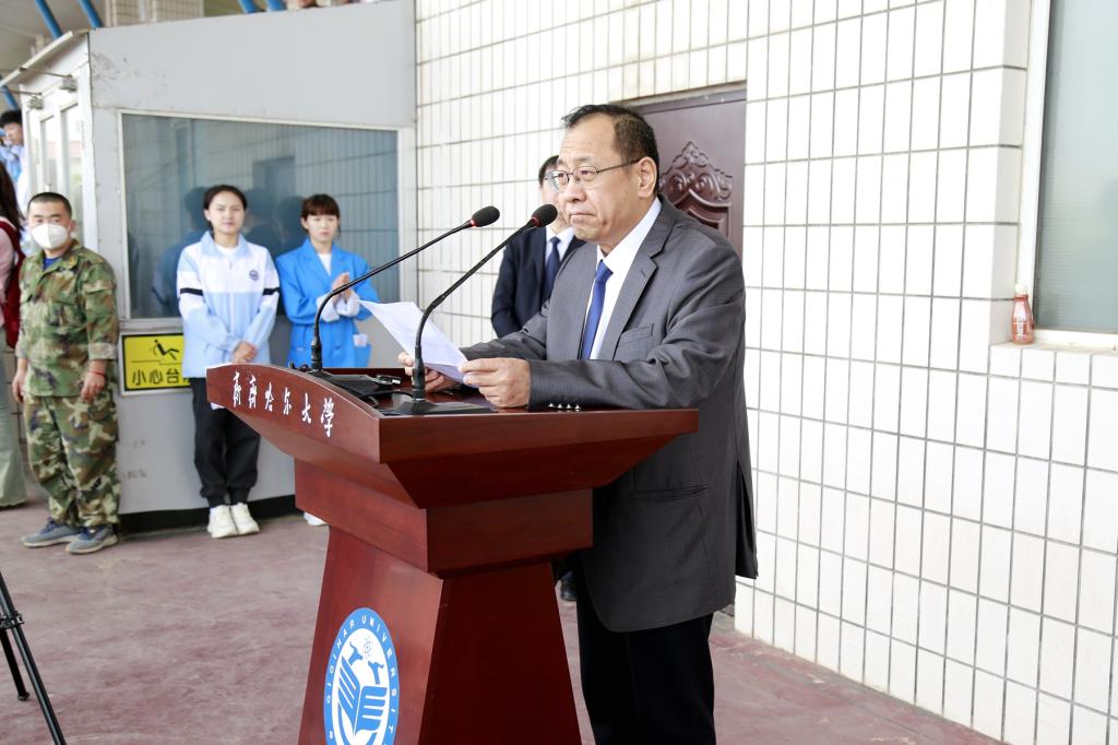 在庄严的升旗仪式结束后,校长董玉庭在大会上致开幕辞。他代表学校对本届运动会的胜利召开表示祝贺,向全体运动员、裁判员以及付出辛勤劳动的工作人员致以诚挚的问候,向热情参与并大力支持学校体育活动,为学校事业发展做出贡献的老师和同学们致以崇高的敬意。