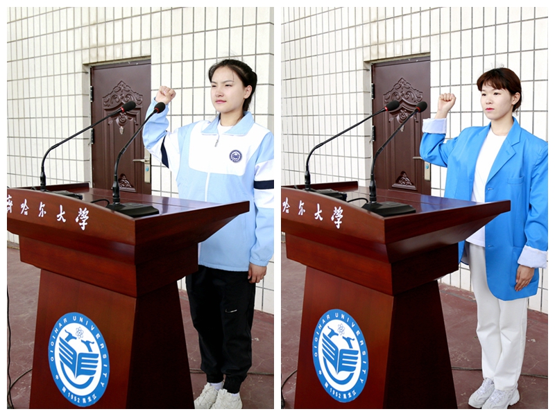 运动员代表教师教育学院学前教育专业203班张思琪代表全体运动员宣誓,裁判员代表体育学院体育教育专业212班邱楠楠同学同学代表全体裁判员宣誓。