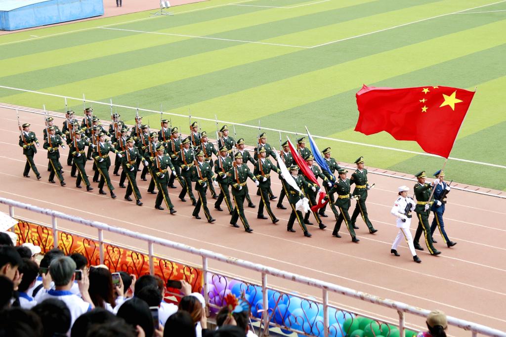 伴随着雄壮的运动员进行曲,包括前导队、裁判员队伍、机关及各学院代表队在内的26个检阅队伍依次走过主席台,接受大会检阅。检阅人员服装整齐,精神饱满,口号响亮,展现了万象城师生良好的精神风貌。