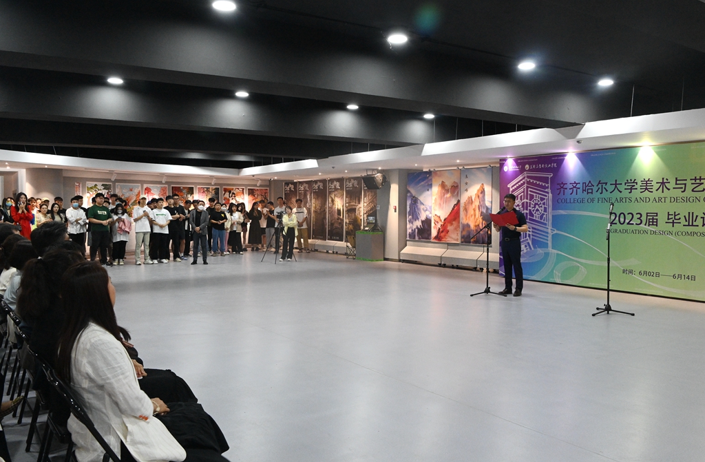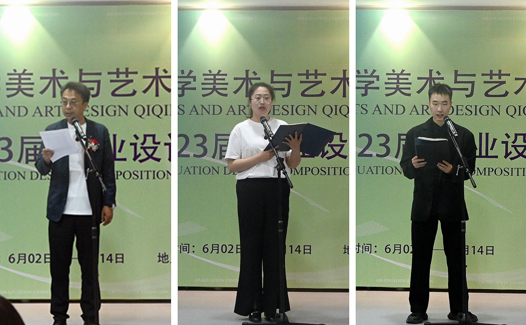 开幕式上,美术与艺术设计学院院长范铁明代表学院致辞;视觉传达设计专业冯静雯老师代表2023届毕业设计指导教师发言;服装与服饰设计专业服装设计191班武冠鸿同学代表2023届全体毕业生发表了毕业感言。