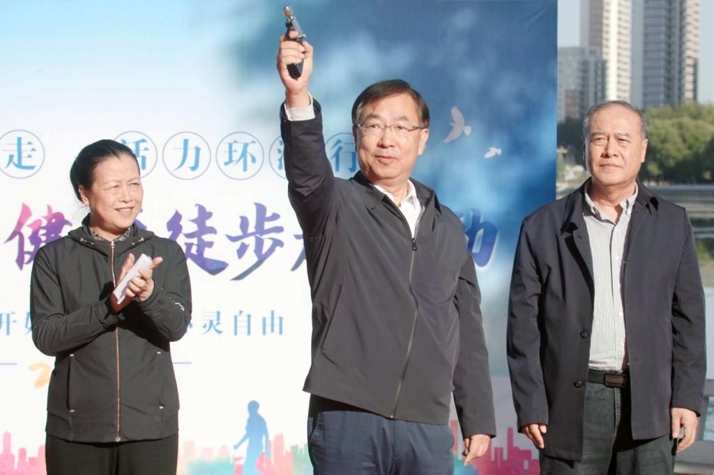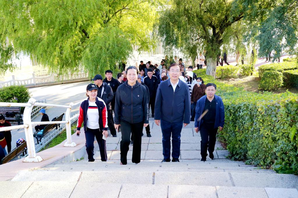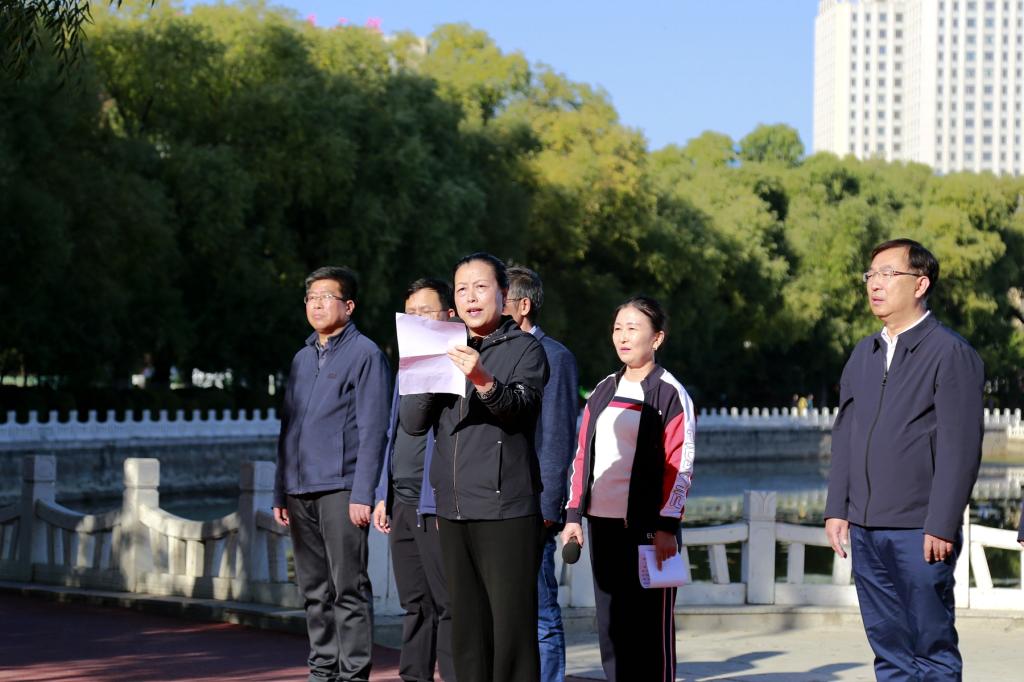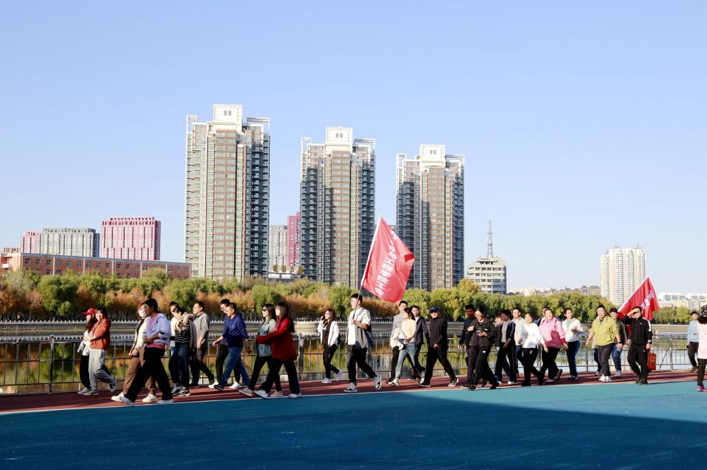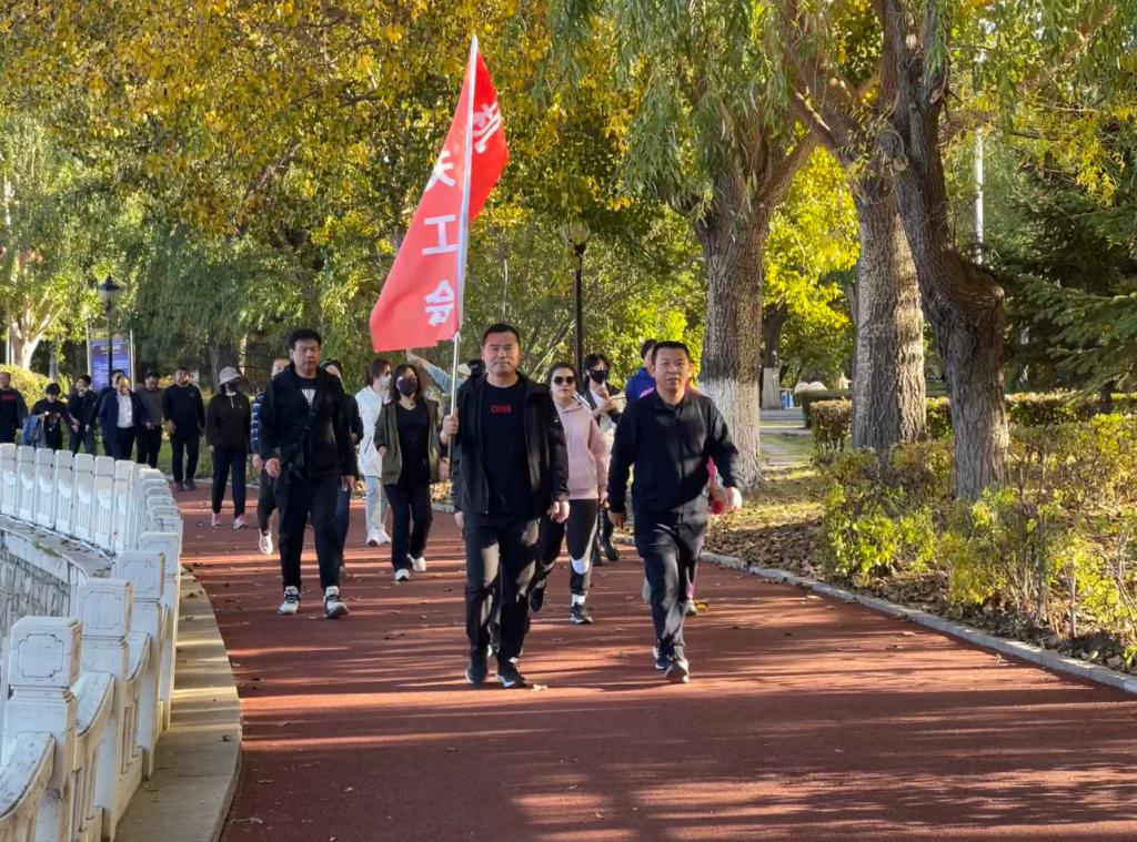 校长、党委副书记郝文斌宣布活动开始,伴随着发令枪声,各基层工会依次列队出发。环湖甬道上旗帜飘扬、人影攒动、身姿矫健,大家在指定地标建筑打卡、拍照,齐大人徒步运动成为秋日劳动湖畔一道亮丽的风景线。