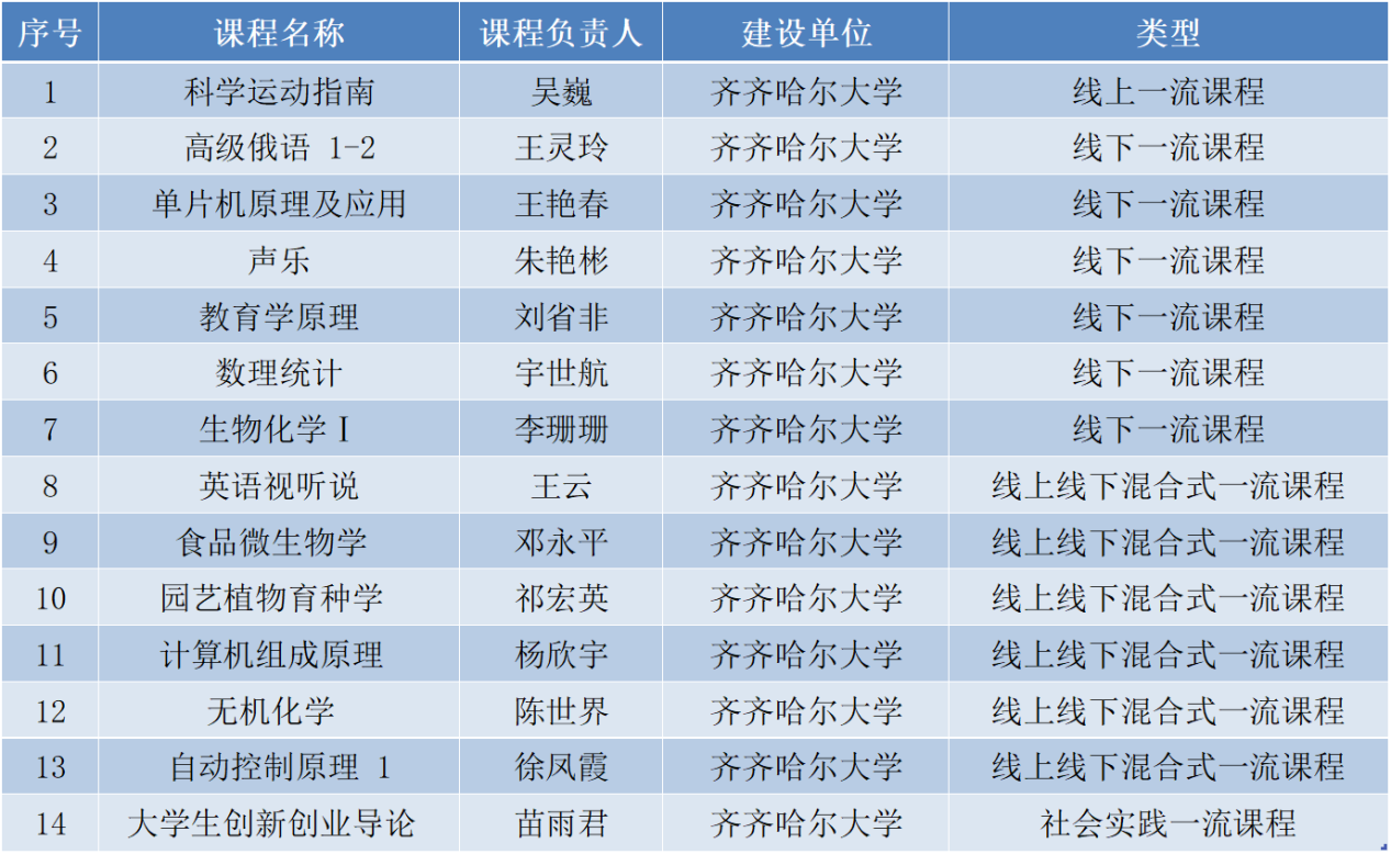 近日,黑龙江省教育厅公示了第三批省级一流本科课程认定结果,万象城14门课程被认定为第三批省级一流本科课程,其中线上课程1门,线下课程6门,线上线下混合式课程6门,社会实践课程1门。截至目前,学校共获批省级一流本科课程38门,其中9门于今年4月获批国家级一流本科课程。