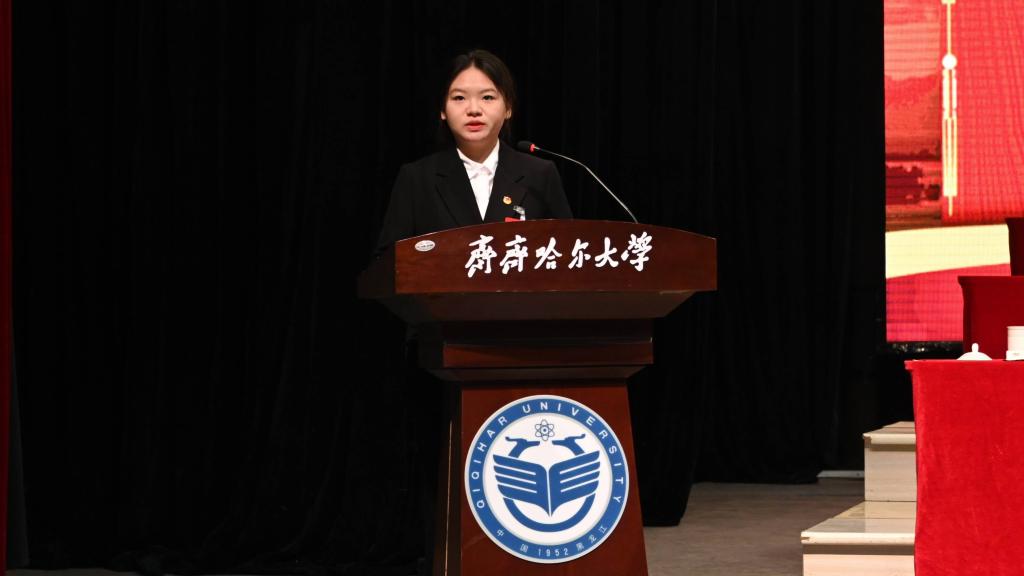 省学联发来贺信,齐齐哈尔医学院学生会主席陆彭代表兄弟院校发言。