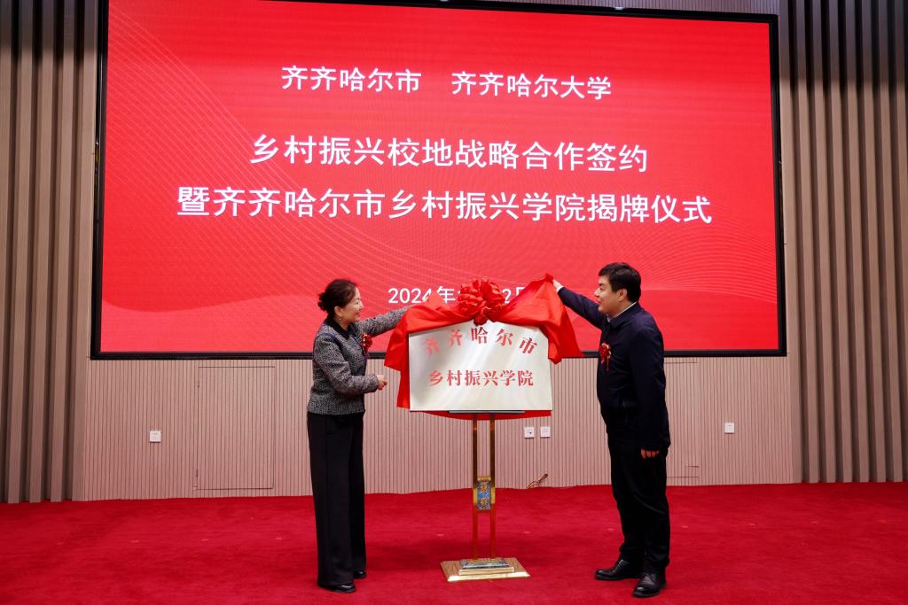 万象城AWC官方网站党委副书记齐宏伟与齐齐哈尔市委副书记刘振江共同为齐齐哈尔市乡村振兴学院揭牌。