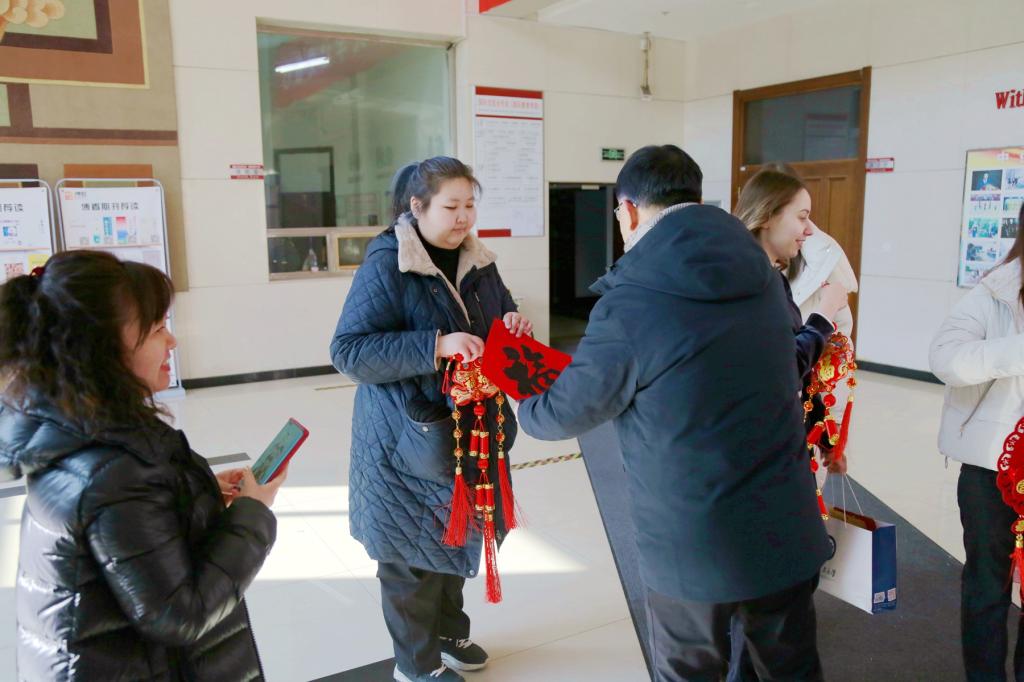 在德润大厦一楼大厅,郝文斌走进留学生中间为大家添喜送福,关切询问家庭状况,对留校的国际师生表达了节日的祝福和深切的问候,并为大家发放了新春大礼包。同时,他叮嘱同学们合理安排时间,注意假期安全,充分利用在龙江过龙年的宝贵契机,进一步感受中华优秀传统文化的魅力。希望同学们成为促进中外交流的桥梁纽带,为中外友好合作交流做出新的贡献。郝文斌表示,“每逢佳节倍思亲。”龙是中华民族的图腾,象征着奋进腾飞,吉祥如意。辞旧迎新之际,学校将更加关心关爱在校学生。祝大家龙行龘龘、前程朤朤、生活䲜䲜,在新的一年里扎根齐大沃土取得可喜成绩。