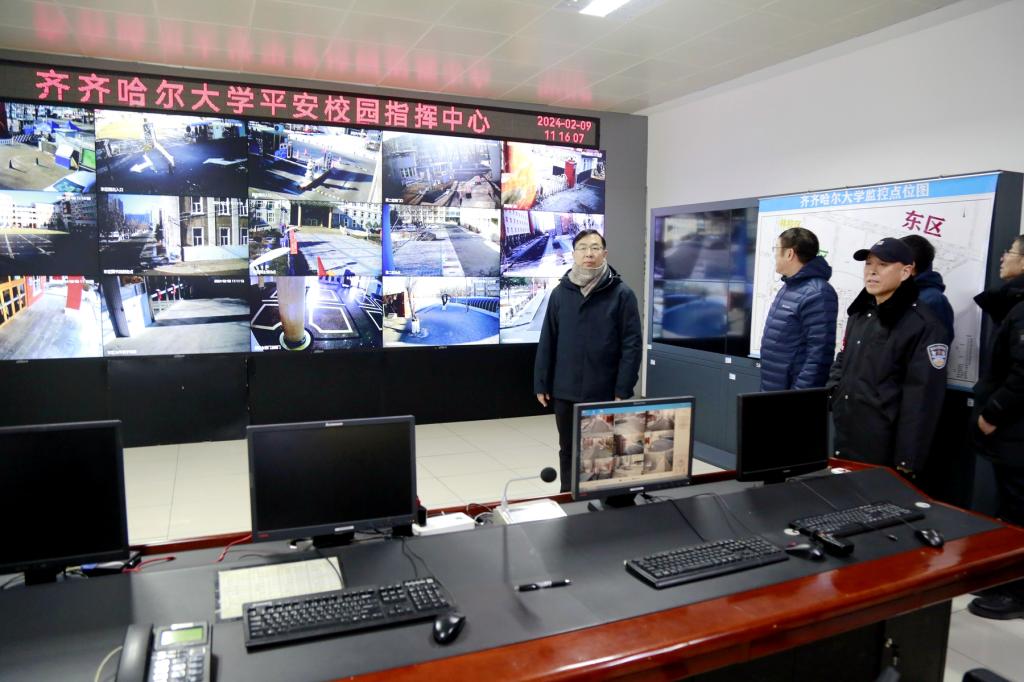在校110指挥中心,郝文斌一行通过大屏幕实时查看了学校的安全保障工作情况。在详细了解值班值守和设备运行保障情况后,郝文斌代表学校向一线值守职工“舍小家、为大家”的精神表示敬意,感谢他们履职尽责、无私奉献,同时叮嘱大家要按照安全生产操作规程做好自身防护和设备隐患排查,以扎扎实实、踏踏实实、求真务实的作风做好本职工作,守好校园安全稳定底线。