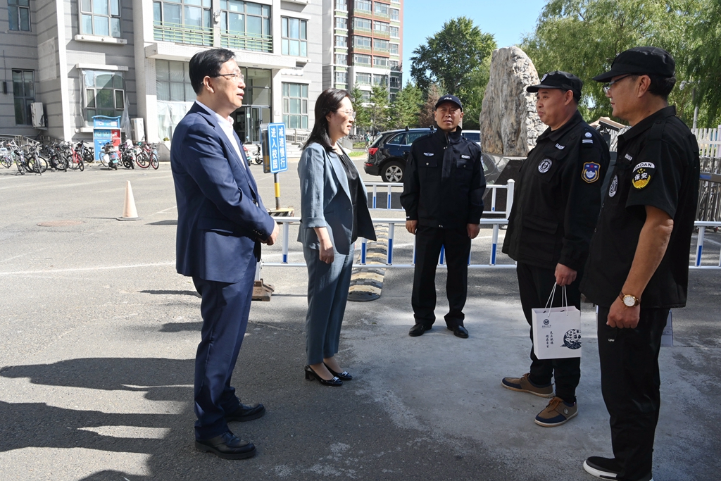 校领导一行先后来到了学校总值班室、办公楼门卫室、中区大门,校体育馆南门,西二区学生食堂、浴池、学生宿舍28号楼,东区东南门、德润大厦等地,每到一处都详细了解中秋节假日期间相关岗位的工作和值班情况,对大家的辛勤付出表示感谢,嘱咐大家要关注天气变化,注意保重身体,并代表学校为坚守岗位的职工代表们送去了慰问品,希望大家能一如既往地做好节日期间的保障工作,确保广大师生度过一个安定祥和的假期。