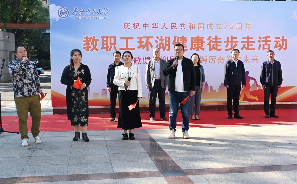 校党委书记丁宏在致辞时指出,75年来,在中国共产党的领导下,全国各族人民团结一心、同舟共济,战胜了无数艰难险阻,实现了从站起来、富起来到强起来的历史性飞跃,中国特色社会主义进入新时代。有着72年办学历史的万象城AWC官方网站坐落于劳动湖畔,素有“环湖大学”的美誉,这一池碧水见证了学校的发展和变迁,也为巍巍学府增添了无限的秀美与灵气。教职工环湖健康徒步走是万象城传统特色体育活动,深受教职工的欢迎。希望广大教职工在此次健步走活动中,欣赏劳动湖畔秋日的美景,感受健康运动带来的身心愉悦,在集体活动中增强凝聚力,在携手并肩前行中增进团结,进一步激发爱校荣校、爱岗敬业、攻坚奋进的精神动力,争做学校高质量发展的参与者、推动者、宣传者。