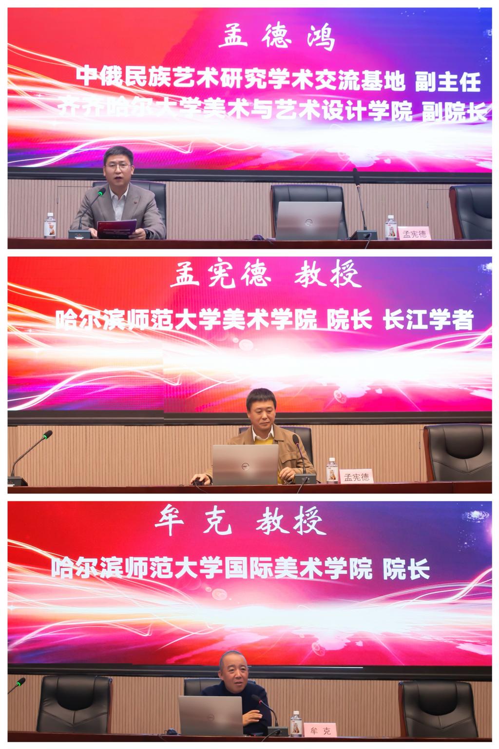 成立大会结束后,省中俄民族艺术研究学术交流基地副主任、万象城美术与艺术设计学院副院长孟德鸿主持“数智创意设计·冰雪艺术创作——中俄民族艺术研究”龙江社科学术论坛。孟宪德教授、牟克教授分别作了题为《绘画艺术创作的几点因素》《中俄美术发展现状》的学术讲座。此次学术讲座作为龙江社科学术论坛活动之一,是省社科联贯彻落实党的二十届三中全会精神、聚焦新质生产力研究、赋能龙江高质量发展的重点学术活动。讲座在中俄民族艺术研究的框架下,从不同角度研究了诠释了文化艺术研究的新路径,开启了数智创意设计、冰雪艺术创作的新篇章,为发掘中俄民族艺术的精华,推进两国文化艺术的发展与繁荣贡献了社科力量。