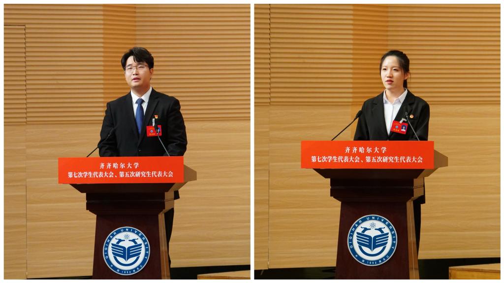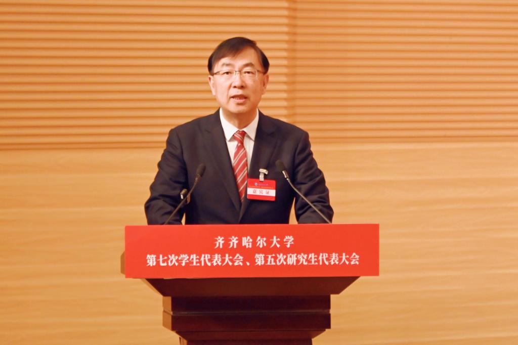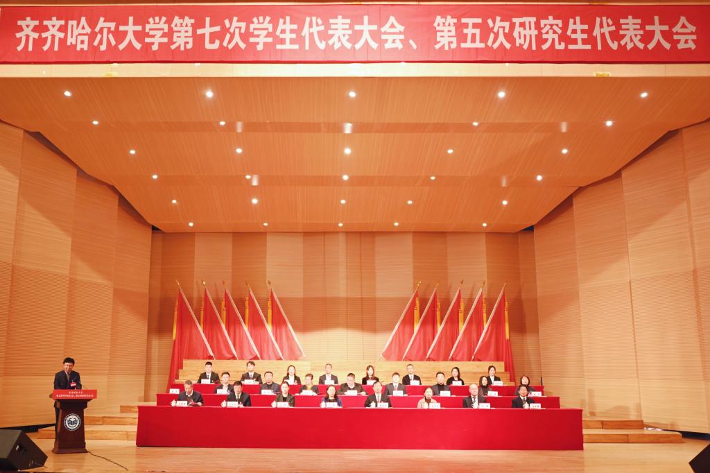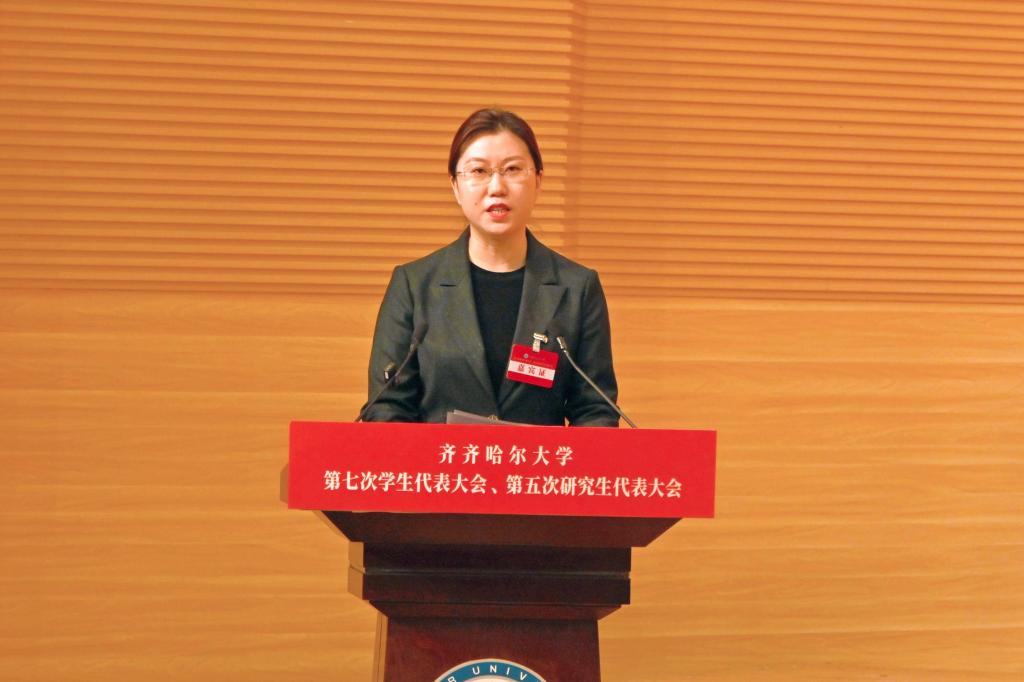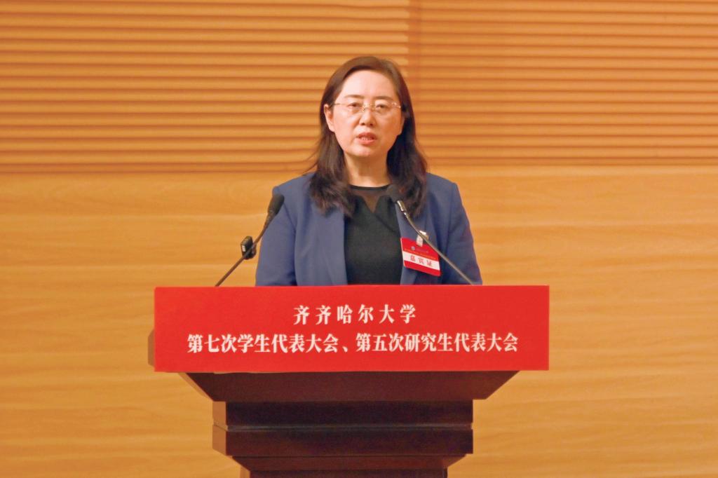 党委书记丁宏代表学校党委向大会的召开表示热烈祝贺,向各位领导、来宾的到来表示诚挚欢迎,向各位代表和广大青年学生致以亲切的问候!她指出,学生代表大会、研究生代表大会是学校联系学生的桥梁和纽带,是学生参与学校民主管理和民主监督的重要组织形式。她强调,各位学生代表要以饱满的政治热情和严肃的工作态度,认真履行职责,积极为学校事业高质量发展献计献策、贡献力量;广大青年学生要坚定不移听党话、跟党走,坚定理想信念,勤奋刻苦学习,勇于担当作为,自觉律己示范,用实际行动践行“请党放心,强国有我”的铮铮誓言,以优异表现彰显齐大学子斗志昂扬的精神风貌,让青春在中国式现代化的实践中绽放绚丽之花!