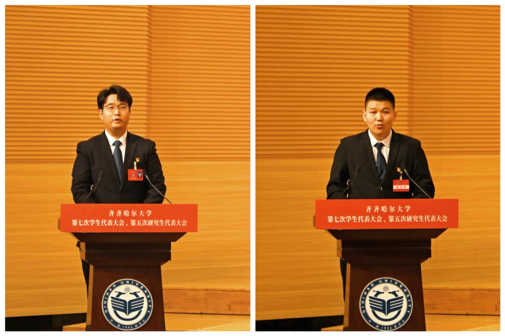 校学生会执行主席孔繁硕代表第六届学生会委员会在大会第一次全体会议上作学生会工作报告,校研究生会执行主席滕菲代表第四届学生会委员会在大会第一次全体会议上作研究生会工作报告。