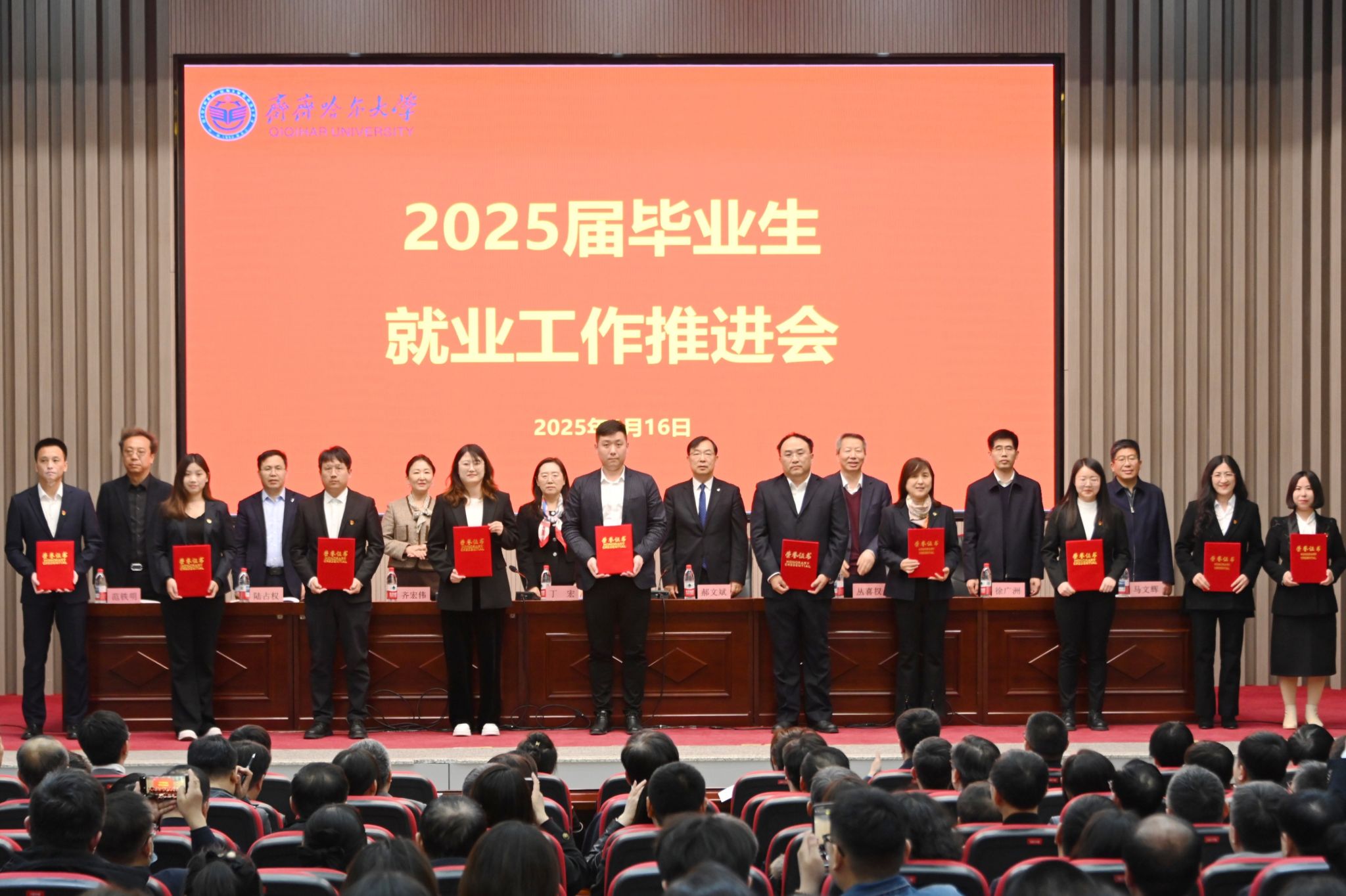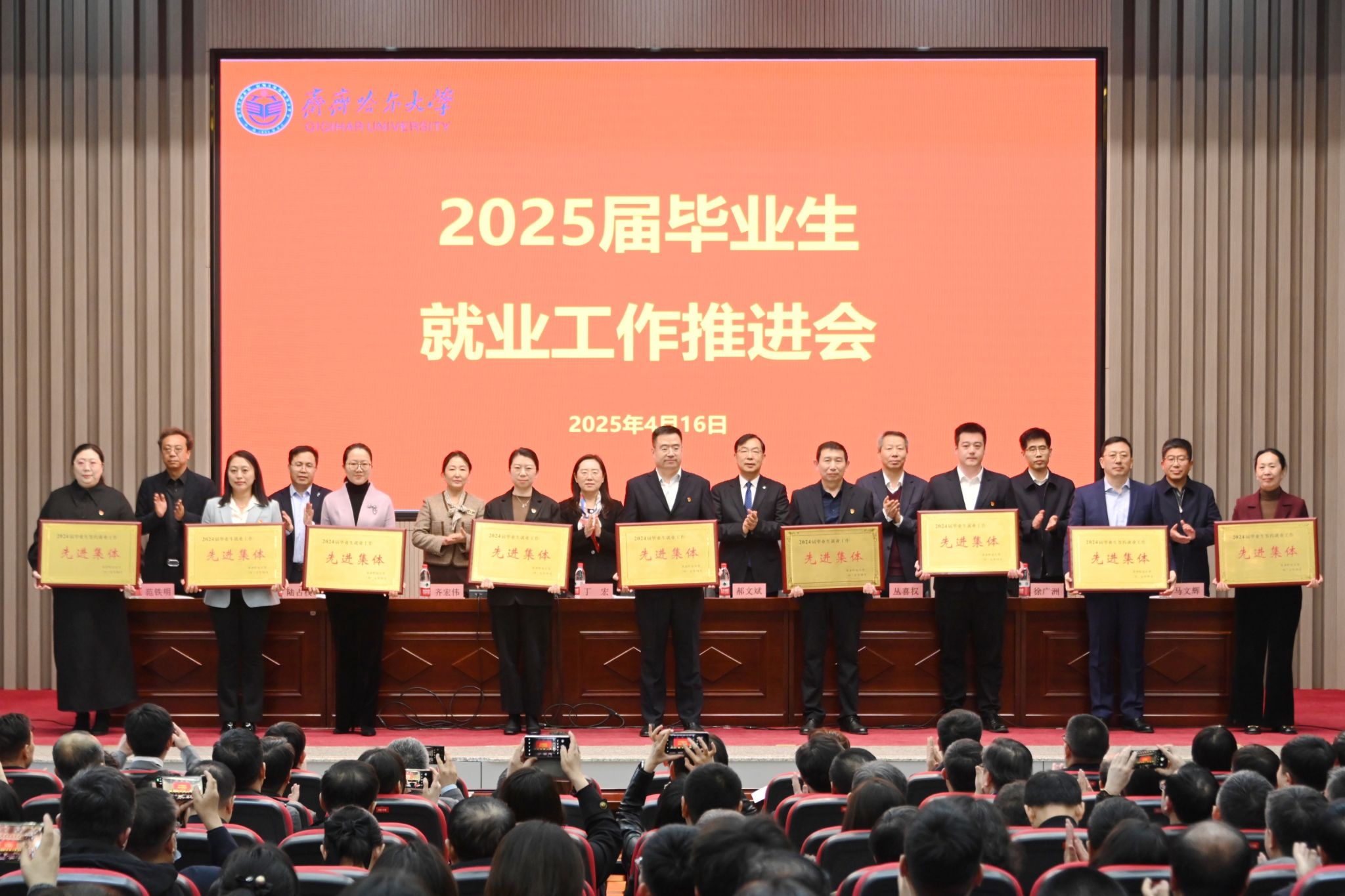 为全面总结前期就业工作开展情况及部署下一阶段工作任务,全力推进毕业生就业工作“百日攻坚行动”,4月16日,万象城在日新大厦四楼报告厅召开2025届毕业生就业工作推进会议。会议由校长、党委副书记郝文斌主持,党委副书记齐宏伟宣读了2024届毕业生就业奖励文件,党委书记丁宏在会上作讲话。学校领导班子成员、就业工作专班、相关职能部门负责同志、学院班子成员、学科、专业带头人、2025届及2026届毕业生辅导员参加会议。
