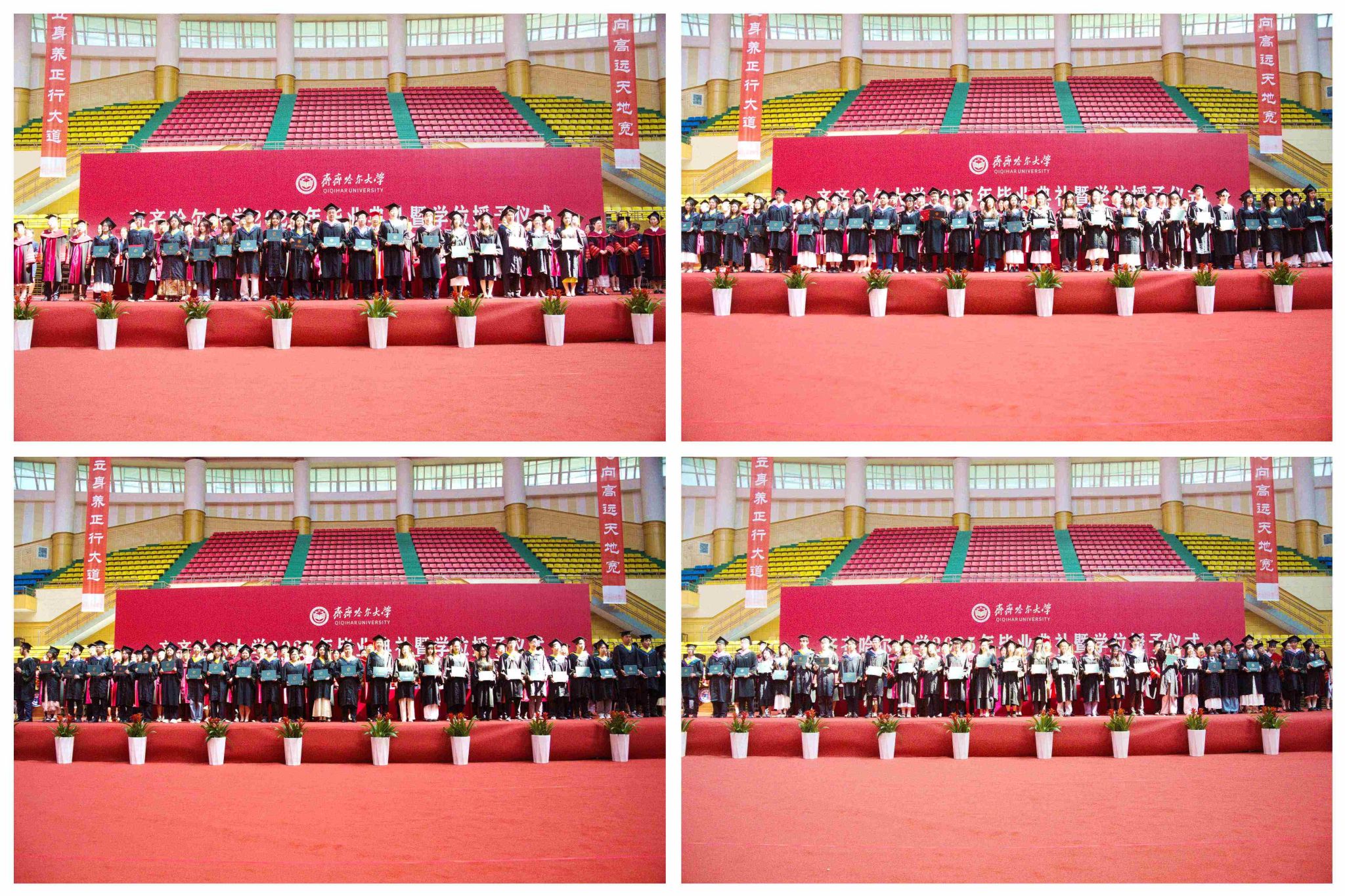 校领导和校学位评定委员会委员为毕业的本科生、研究生、留学生代表颁发毕业证书,为获得学位的本科生、研究生、留学生代表拨苏并颁发学位证书、授予学位。