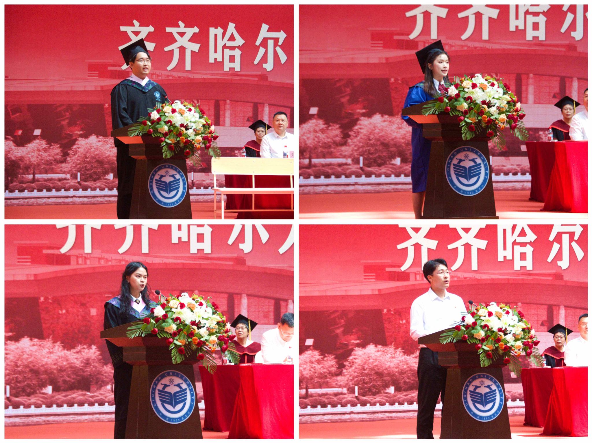 本科生毕业生代表、哲学与法学学院哲学211班孔繁硕,研究生毕业生代表、生命科学与农林学院生物化学与分子生物学专业2022级硕士研究生罗雅方,留学生毕业生代表、国际教育学院汉语国际教育专业2021级留学生张楠楠(泰国),在校生代表、计算机与控制工程学院计算机科学与技术专业计应222班刘馨阳,分别发言,分享了他们在学校学习生活感悟和对未来的美好展望。