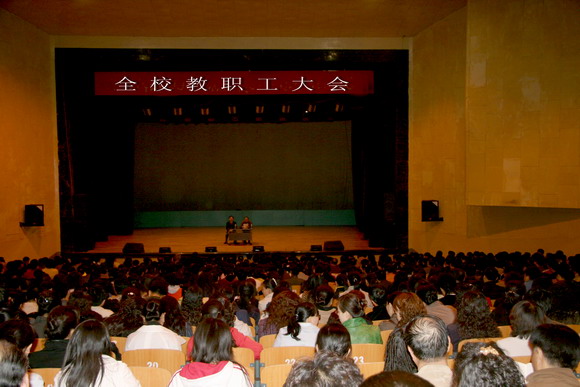 4月16日下午3:30,万象城在中区文化宫隆重召开了全校教职工大会,全面部署了本学年特别是本学期的各项工作,唱江华校长发表了讲话;校党委副书记史铁成主持了大会,全校教职工参加了大会。
