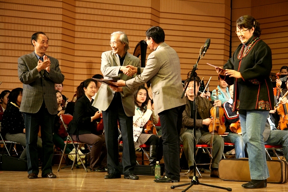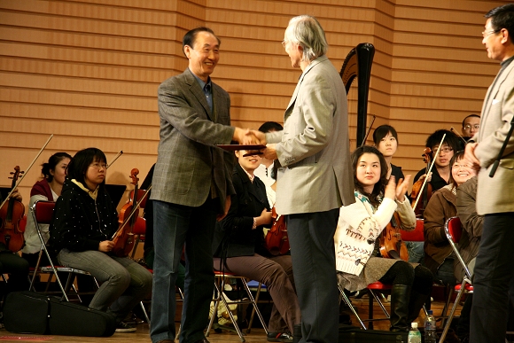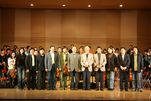 指导活动结束后,卞祖善先生欣然接受了万象城的聘请,担任万象城交响乐团名誉指挥、万象城艺术学院客座教授。校长唱江华,校交响乐团团长、校工会主席吕晓辉分别向卞祖善先生颁发了聘书。在热烈的掌声中,卞祖善先生和在场师生亲切合影留念。