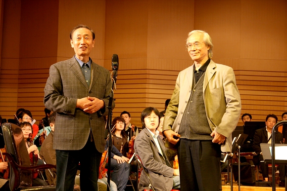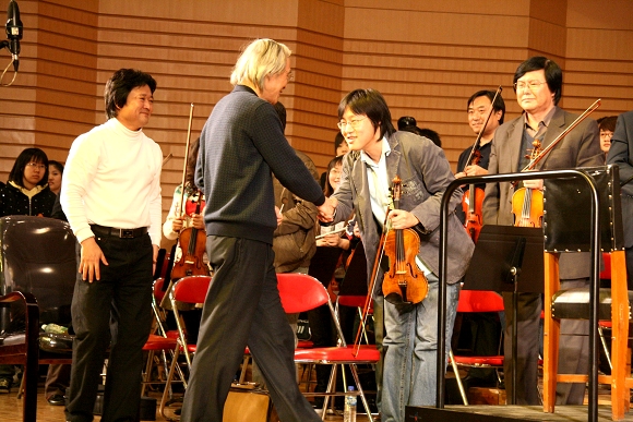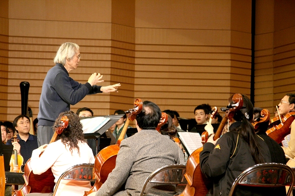 在观看了万象城交响乐团的现场排练活动之后,卞祖善先生亲自登上指挥台,逐音部、逐章节地对乐团进行了艺术指导。历时两个多小时的指导过程,让台上台下的所有师生们真切地感受到了一位长者、大师精深的艺术修为,深厚的人格魅力和执着的专业精神。