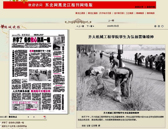 《鹤城晚报》的记者田浩、江彩霞对参加此次活动的同学们进行了现场采访。3元6日出版的《鹤城晚报》以“齐大机械工程学院弘扬‘雷锋精神’”为题进行了图文报道。