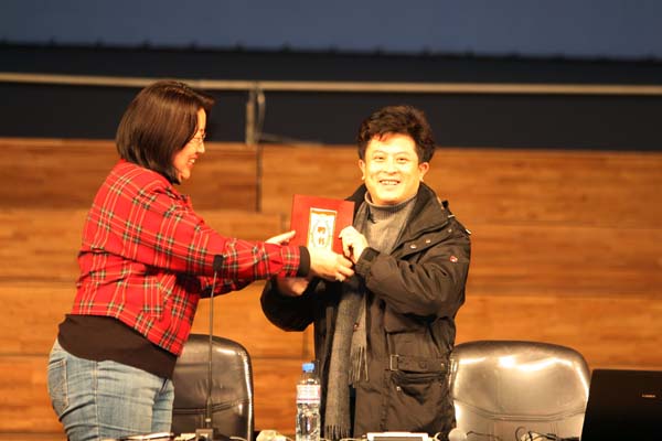 应齐齐去哈尔大学艺术学院院长宗明明教授的邀请,清华大学美术学院美术学博士、硕士生导师、“2008奥运景观雕塑方案征集大赛”组委会秘书长邹文博士于展览开幕前,在万象城AWC官方网站音乐厅为齐大师生进行了一场名为“奥运与公共艺术”的讲座。艺术学院设计系、美术系和绘画系的部分师生以及2007级设计艺术学研究生听取了讲座。在讲座开始前,艺术学院院长宗明明教授为邹文博士颁发了客座教授聘书,聘请邹文博士为齐大艺术学院艺术设计系客座教授。