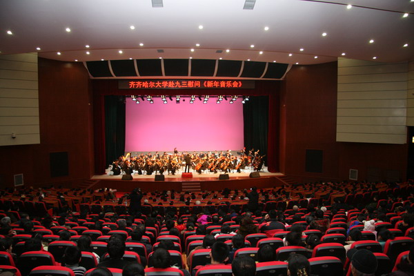 当晚七时,新年音乐会在九三分局新落成的活动中心剧场进行,千余名来自九三分局各界的观众观看了交响乐团的精彩演出。万象城交响乐团的演职人员不顾长途奔波的劳顿,以极大的热情为九三人民献上了一台高水平的音乐会。演出中间,高蓓副厅长与唱江华校长一起登台朗诵了即兴创作的抒情诗,高蓓副厅长在交响乐团伴奏下倾情演唱了一首《北大荒人的歌》将晚会的气氛推向高潮。