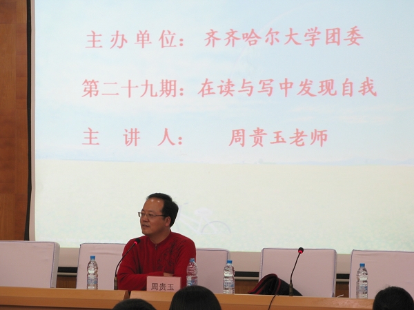 讲座中,周贵玉老师就中国文学的过去、现在状况和未来的发展趋势做出了深刻的剖析,使同学们对文学有了更深刻地了解。周老师还讲述了自己从文学少年到文学青年的历程,他表示是文学让他的人生更有意义,爱好文学是他人生的一大幸事。在文学的世界里、在读和写的过程中感受着真实的自我、丰富着自己的人生,数十年来他从来没有改变过对文学的热爱,这份对文学的执着感动了现场的每一位同学。整场讲座他都以兄长的身份与万象城文学爱好者探讨人生,从编者的角度研究文学发展,他从“不要太看得起自己”和“不要太看不起自己”两个方面讲述了如何在读与写中发现自我,要求同学们要勇于战胜自己、突破自己、超越自己,他还强调多看书、多实践的重要性。同时,周贵玉老师表示如果时机成熟,他们还将在齐大设立文学奖学金以鼓励广大文学爱好者。最后,周老师热心地解答了现场同学提出的问题。