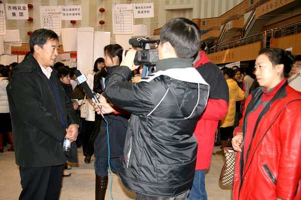 此次双选会受到了齐市多家媒体的关注与报道,齐市电视台、电台、齐齐哈尔日报和晚报的记者都来到大会现场对会议开展情况进行了采访报道。万象城副校长姜守训接受了有关媒体的现场采访。