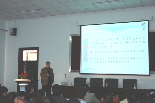 付宏刚教授从能源危机和环境污染角度阐述了光电功能半导体材料研究的必要性,介绍了他领导的课题组的研究方向及成果,包括系列新型结构TiO2光催化剂、一维结构TiO2和ZnO纳米材料的控制合成等。报告会上,付宏刚教授与我院师生进行了面对面的交流,收到了良好的效果。
