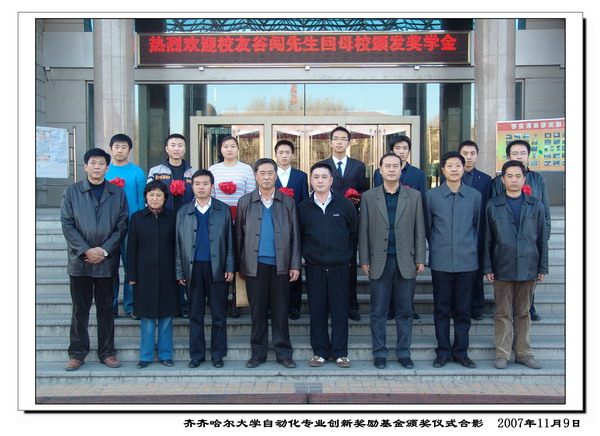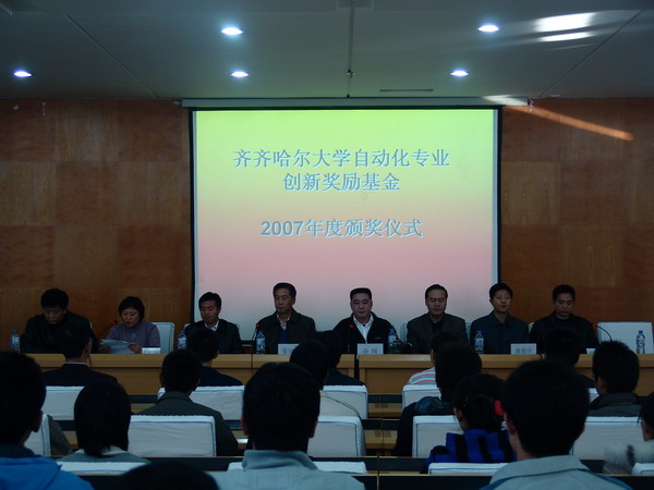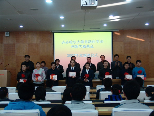 颁奖仪式上,与会领导和谷闯先生共同为获奖学生颁发了奖金。自动化专业04级、05级共有8名学生获得了奖励。