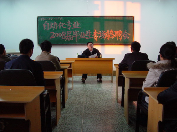 讲座结束后,计控学院在西主428室召开了一次小型招聘会。北京中电兴有限公司、北京智建联合电子科技有限公司、北京世纪实拓科技有限公司、北京四海实拓科技有限公司、北京时进展望科技发展有限公司等五家企业介绍了公司情况,初步选定了十几名毕业生寒假期间到北京进行实习。计控学院高度重视学生的就业工作,抢前抓早,积极筹划,多方联系,为08届毕业生就业工作打开了一个良好的开局。