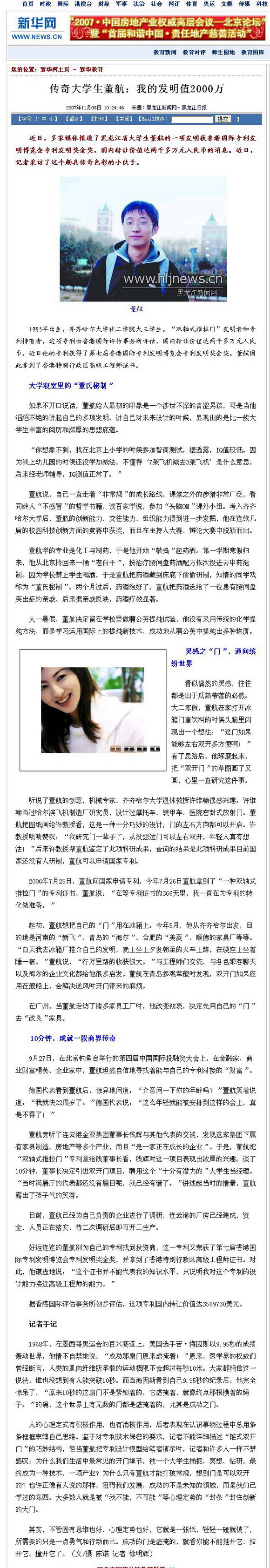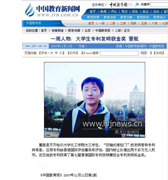 2007年11月11日的《中国教育报》第2版上刊登了董航同学的大幅照片,并配发文字说明,将“大学专利发明获金奖—董航”醒目地列为了“一周人物”。