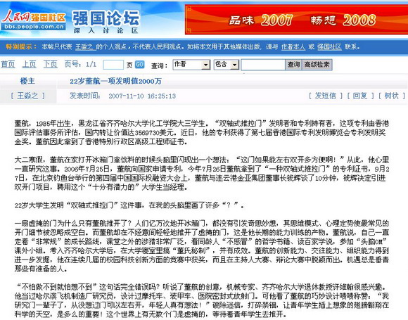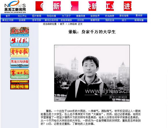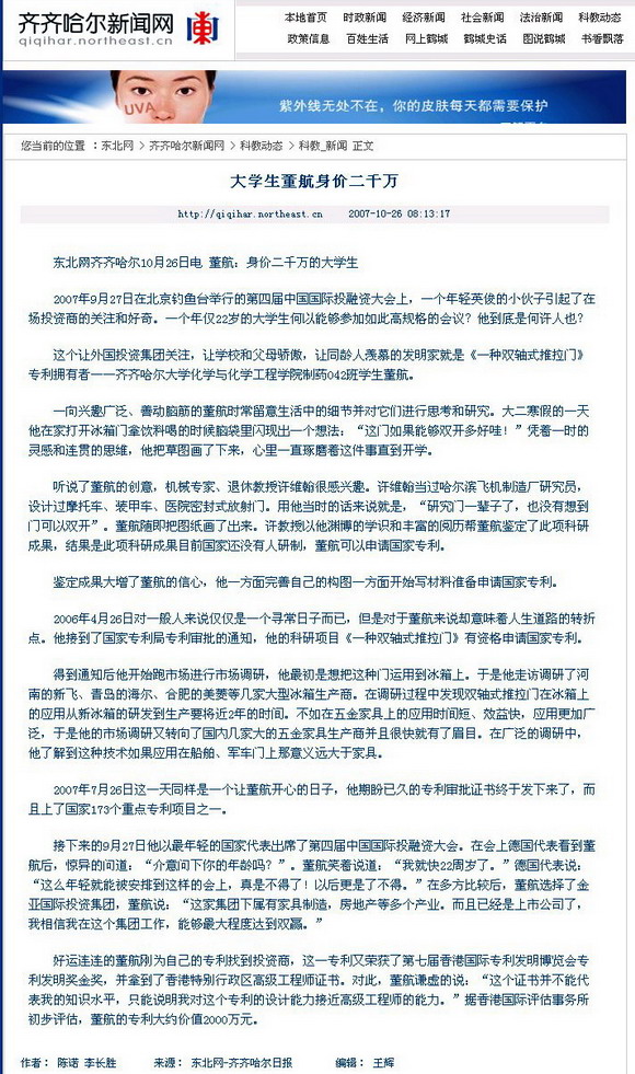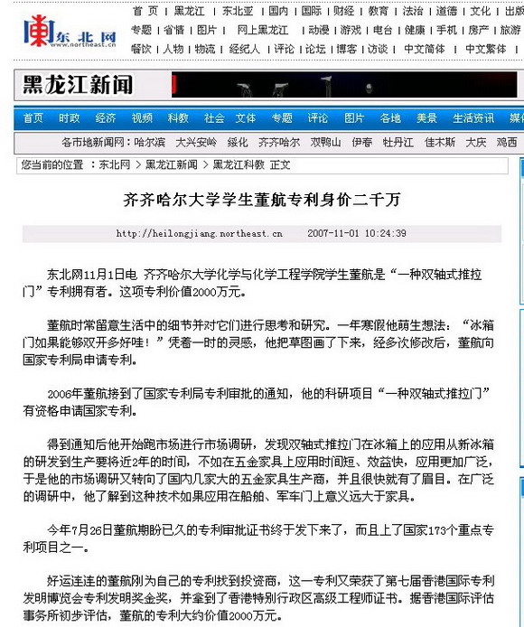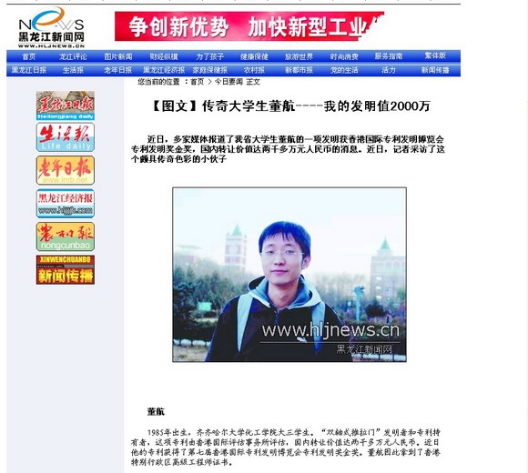 《黑龙江日报》记者徐明辉专程从哈市来校专访董航同学,并用如椽妙笔撰写了《传奇大学生董航—我的发明值2000万》,并配图发表在2007年11月9日出版的《黑龙江日报》上。
