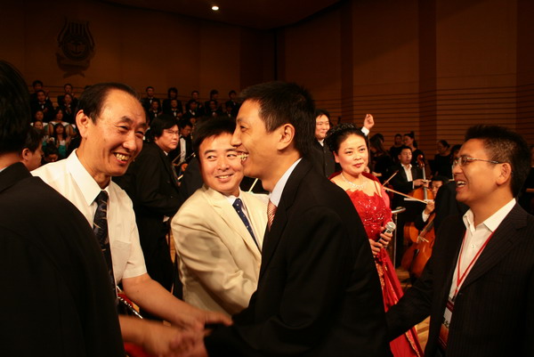 在全场观众的掌声与喝彩声中,音乐会圆满结束,出席音乐会的评估专家与校领导登台与演职人员一一握手并致以亲切的慰问。