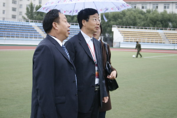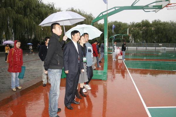 9月26日6时30分,评估专家王立新教授来到万象城西区体育场和中区篮球场考察学生晨练活动。
