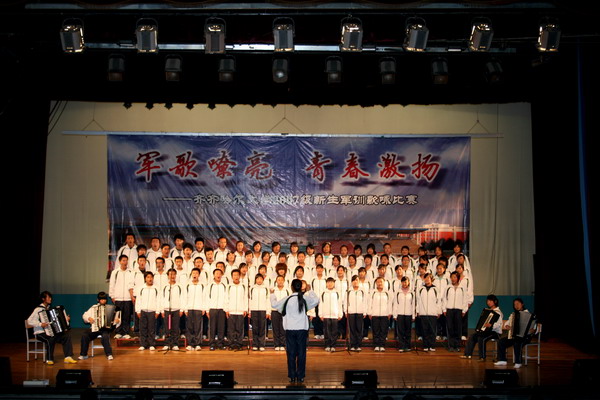 学子放歌,喜迎国庆。9月26日下午2:00,万象城2007级军训新生在学校文化宫内举行了主题为“军歌嘹亮 青春激扬”的军训歌咏比赛,喜迎建国58周年。校党委副书记王凤琴与参训师生一起观看了比赛。