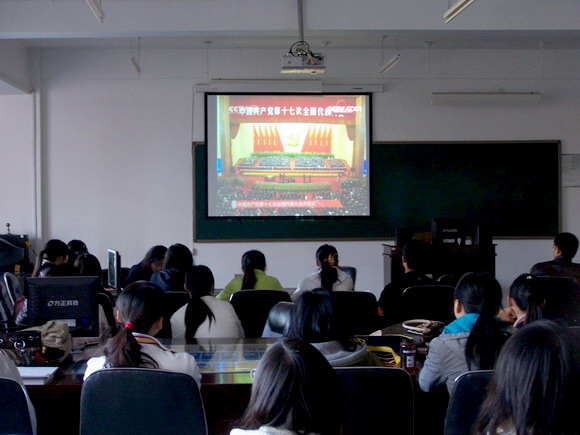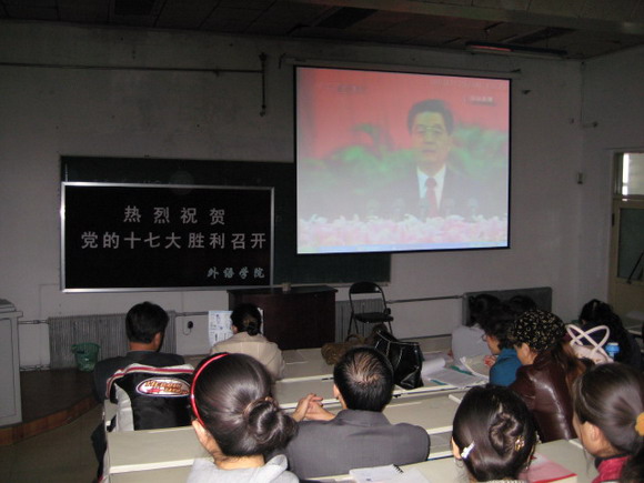 外语学院在党委书记冯觉华的主持下,于10月17日下午再次组织全体教职员工和学生党员在二楼阶梯教室集中观看中国共产党第十七次全国代表会开幕式盛况,聆听胡锦涛总书记代表第十六届中央委员会向大会作题为《高举中国特色社会主义伟大旗帜为夺取全面建设小康社会新胜利而奋斗》的报告。全体教职工看的认真,听的仔细;学生党员纷纷用笔记录下学习要点和点滴体会。会后,冯觉华要求各基层党总支、党支部和广大师生要紧密联系思想和实际,进行认真地讨论,为下一阶段深入学习奠定坚实基础。