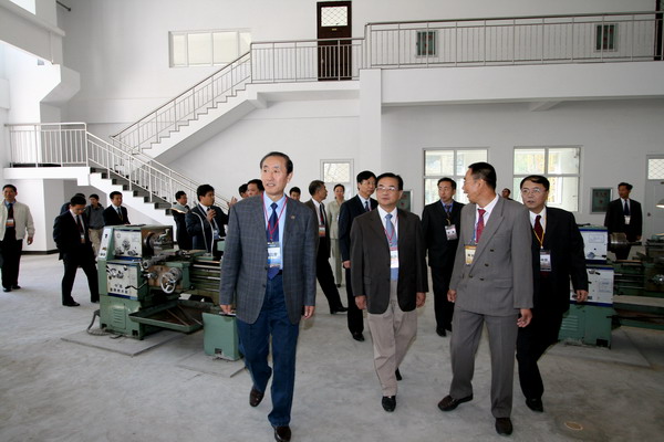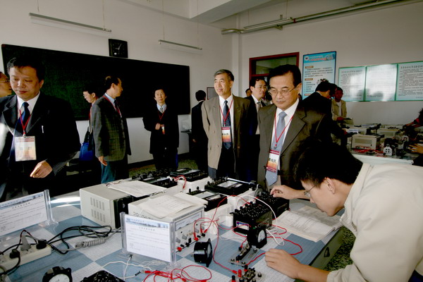 专家们来到新落成的工程训练中心 ,考察金工实习、电工电子实验室