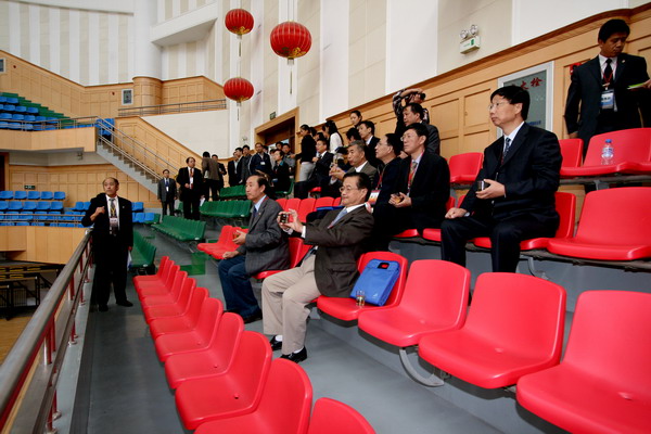 专家们来到体育馆,考察体育馆主馆、体操馆、乒乓球馆、健美操馆、健身房