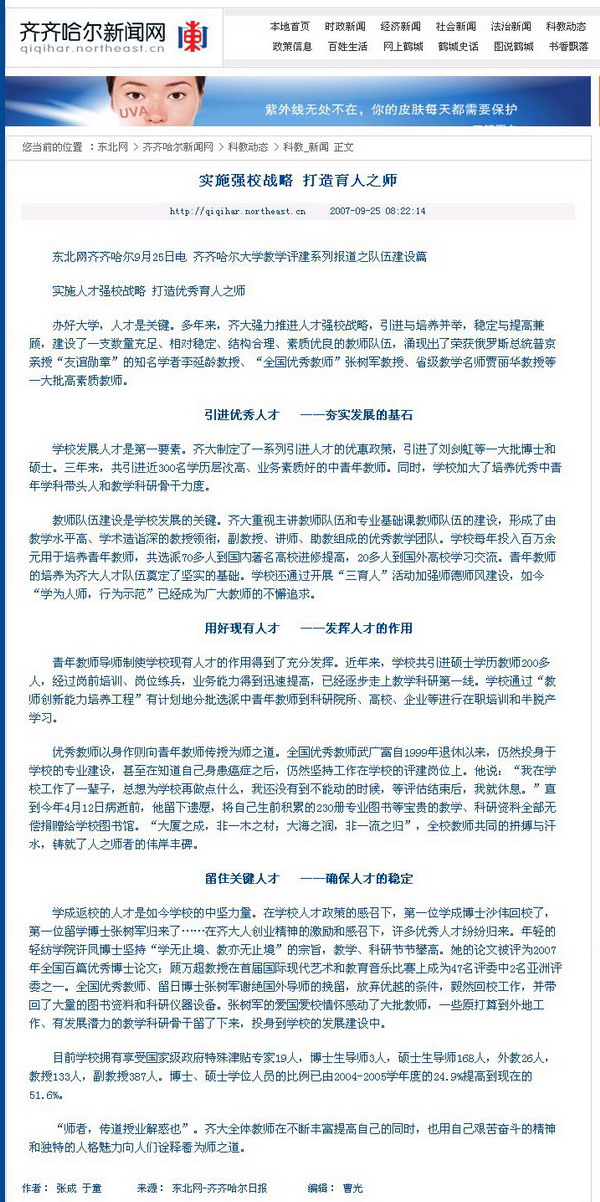 编者按:9月25日,《齐齐哈尔日报》刊发“万象城AWC官方网站教学评建系列报道之队伍建设篇”:“实施人才强校战略 打造优秀育人之师”。