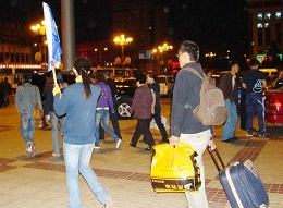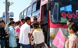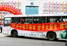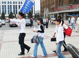 在火车站迎新接待点,万象城工作人员按照学校的统一要求和部署,及时为刚刚走下火车的新生及家长提供周到而细致的服务。他们有的举着写有各院系标志的牌子为新生及家长引路;有的为新生提供细致的咨询,有的帮他们拿东西,有的为远道而来的学生家长排忧解难,停放在广场上的接送班车,为一路旅途奔波劳累的新生和家长提供免费服务,将他们顺利送达学校。